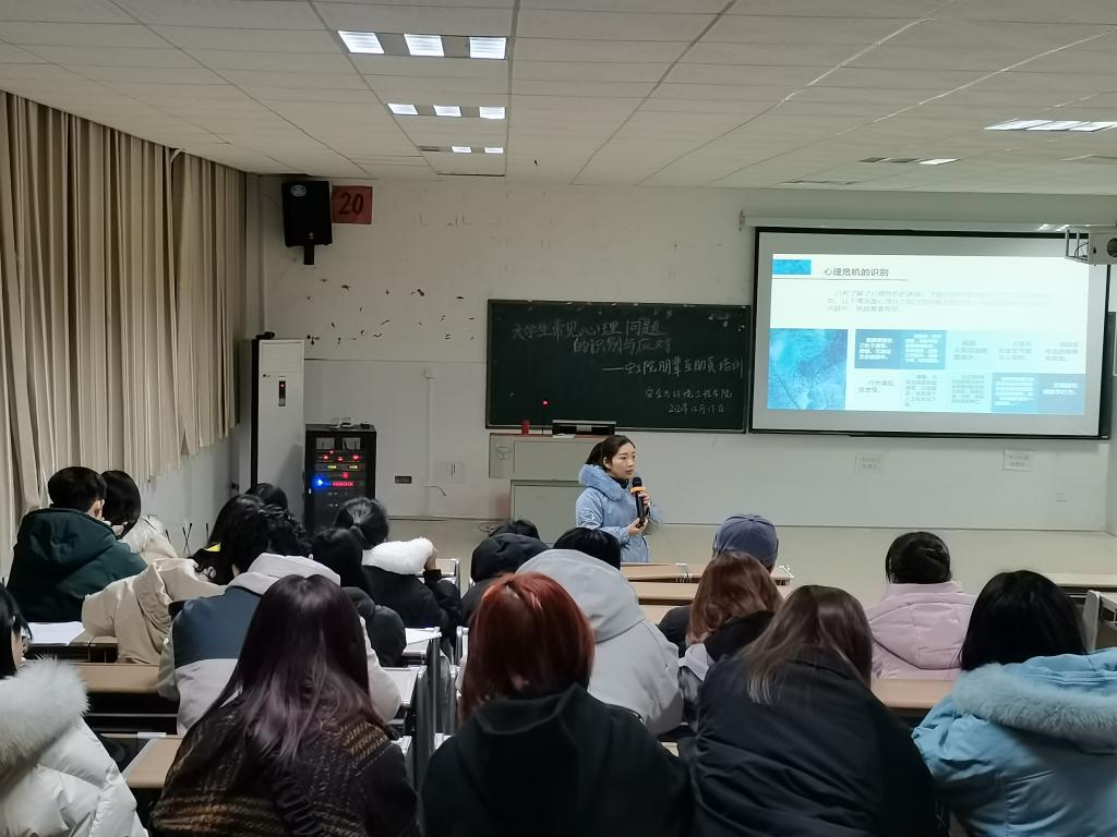 为全面推进安全与环境工程学院心理健康教育工作的开展,使心理朋辈互助员明确自身责任,做好班级学生心理健康工作,12月17日晚19点,学工办主任兼心理指导老师代俭英以《大学生常见心理问题的识别与应对》为主题在安工楼5601报告厅对学院全体朋辈互助员进行了专题培训。