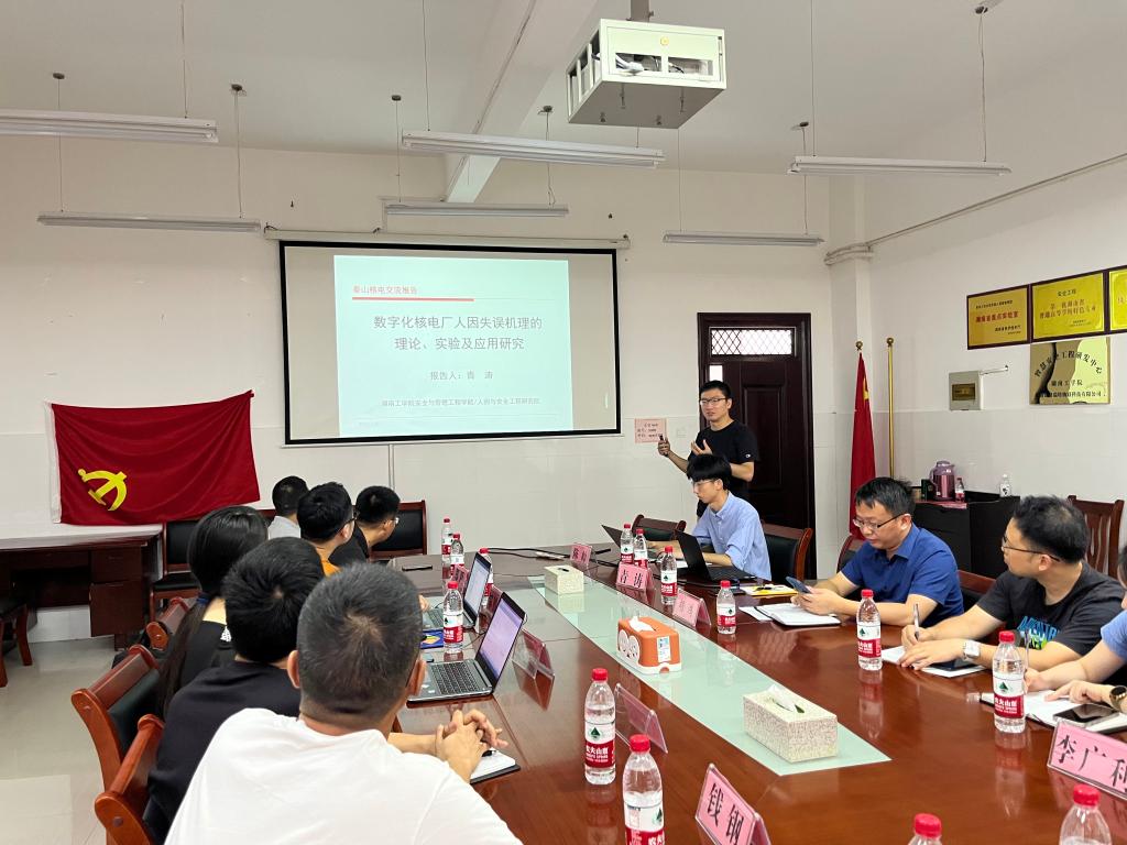 2023年7月4日,中核核电运行管理有限公司安全分析处邹胜佳高工、运行培训处章红伟高级教员等一行6人来我院交流核电厂数字化主控室防人因失误理论与实践。安全与管理工程学院院长胡鸿、副院长青涛,及多位教师参与此次交流。
