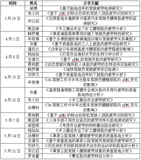3月25日至5月21日,安工学院易灿南老师组织职业安全与健康团队本科生新成员在5608展开一周一汇报的文献分享会。分享会旨在提升本科生文献阅读与分享能力。分享会由程阳同学总体组织,冷成杰、刘逸帆、肖楠以及龙彬具体实施,2023年新加入团队成员参加此系列会议。