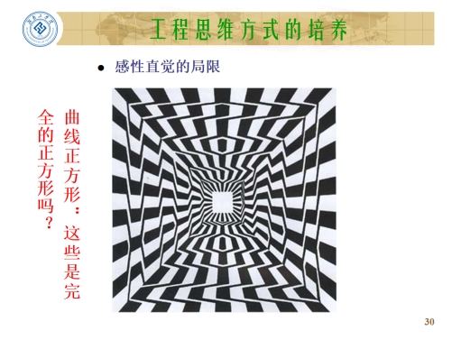 接下来,通过对“科学思维”、“工程思维”、“文学思维”以及“艺术思维”等思维方式的对比,引出“工程思维方式”的重要特征——发散性,即“创造性”本质。并列举了“人类感知的局限性”的案例,分析、引导同学们拓展“理性思维”,积极开发和培养“工程思维”。