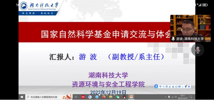 1219日上午,湖南科技大学游波副教授应邀为安全与管理工程学院教师作了一场题为“国家自然科学基金申请分享交流与体会”的线上学术讲座。讲座由安工学院院长胡鸿主持。安工学院部分教师参加了此次讲座。
