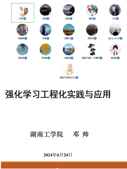 2024624日晚上1930,我院邓帅副教授应重庆工商大学教职委专家龚英教授邀请在腾讯会议与重庆工商大学管理学院研究团队开展学术讲座与交流,邓帅围绕强化学习工程化实践与应用主题分享他的宝贵经验,安全与管理工程学院以及学校其他相学院老师参加此次讲座。