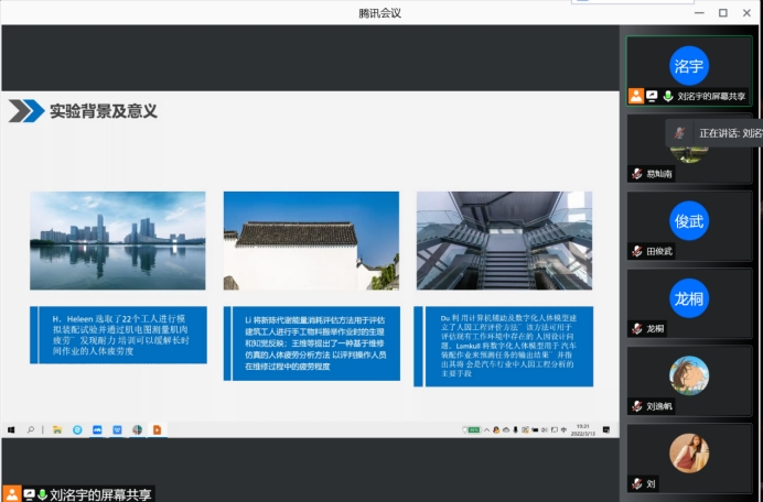 会议开始,刘洺宇同学汇报《基于能量分析的装配作业疲劳改善研究》文献阅读情况,讲述了该论文的主要内容并分享了自己对此论文的理解。随后,该项目组成员对此进行了提问,刘洺宇同学对其问题一一回答,最后,易灿南老师对刘洺宇同学的汇报及问答进行点评,引导同学们关注论文关键核心点。