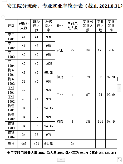 截止至昨日(2021年8月31日),安全与管理工程学院2021届毕业生就业工作以全院就业率94.3%的傲人成绩完美收官,再次成为全校就业率第一的学院。从专业上看,安全工程、工业工程、物流工程、物流管理的专业就业率均超过了90%;从班级上看,12个毕业班的班级就业率也都超过了90%,其中安全工程1704班的班级就业率甚至达到了100%;从就业质量上看,有接近4成的毕业生去了国企单位就职,其中的大部分比例都入职于中交、中建、中铁等知名央企。从考研情况看,我院有34名毕业生考研成功,考研成功比例为全校前列,录取院校中不乏985、211院校。