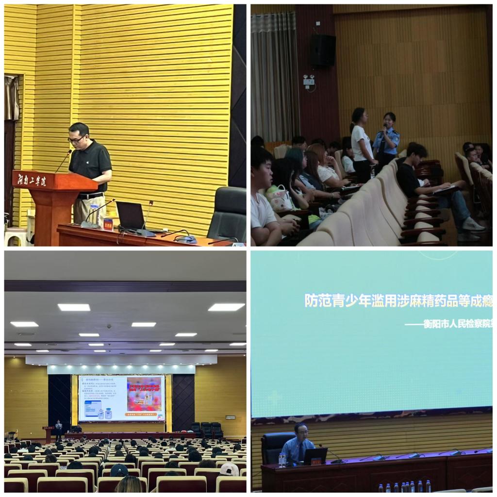 衡阳市强戒所谭澳俐警长以《规范用药、远离毒品》为主题,通过播放真实案例视频,详细讲解了新型毒品的伪装形式和滥用药物成瘾的危害。提醒广大师生注意所谓的“聪明药”、“减肥药”等可能含有精神药品的潜在风险,强调规范处方用药的重要性;衡阳市检察院罗宁宇检察官以《防范青少年滥用麻精药品等成瘾性物质》为切入点结合近期办理的青少年涉毒案件,通过以案说法的方式,剖析了药物滥用与违法犯罪的关系。本次讲座由保卫部副部长陈海辉主持。最后,陈部长在讲座总结中强调:麻精药品等成瘾性物质对青少年的危害,号召大家“珍爱生命,远离毒品”,并将讲座所学知识传递给身边人,共同努力营造无毒校园。