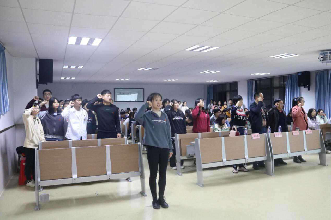 仪式正式开始,奏唱《国际歌》后,刘湘欣书记为本次宣誓致辞,他要求党员们要保持政治上的清醒和镇定、树立崇高的理想信念、积极履行党员义务。接着,由党支部负责人为本支部预备党员佩戴党徽,由张宇琴同志带领所有预备党员进行入党宣誓,随后,由预备党员代表王浩发言,他表示所有预备党员应把入党誓词作为自己终身的追求、终身的修养和终身的实践,最后集体奏唱《国歌》宣布入党宣誓结束,并由李书记为本次积极分子培训班致辞,他要求所有参训成员应当端正学习态度,思想上积极向党组织靠拢。接着,由集体学生代表龙家成发言,他表示我们作为新青年,要时刻反省自己,提升自己。随后,陈凌霄对本次积极分子培训班考核的内容、要求及方式进行介绍。最后,由刘湘欣宣布第十二期积极分子培训班正式成立并进行授课。在此次课程中,刘湘欣为同学们阐述了新时代中国特色社会主义思想,分析了新的国际环境孕育的新时代中国特色社会主义思想,为我院积极分子提升了各方面认知。