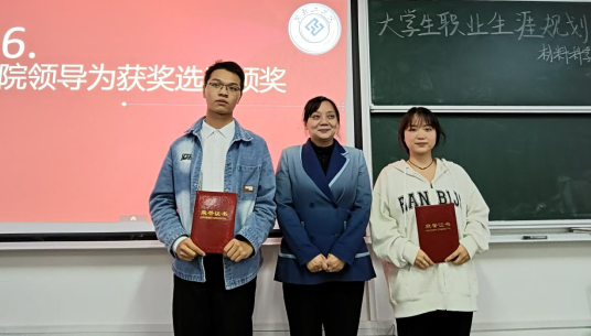 经过激烈的角逐,欧阳凯、贺金凤、莫垚坤荣获成长赛道一、二、三等奖,罗文静、石广、何佳立荣获就业赛道一、二、三等奖,领导老师为获奖选手颁发证书。