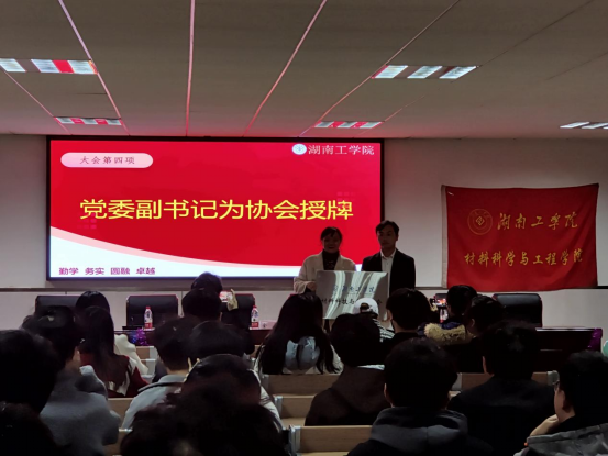 熊鑫为第一任会长乔婧授会旗,乔婧作述职报告。熊鑫寄语会员积极参与协会的各项活动,为协会的发展贡献出一份力量,融入协会的大家庭之中,努力让材料科技与创新协会成为一个有凝聚力、有向心力的优秀协会!