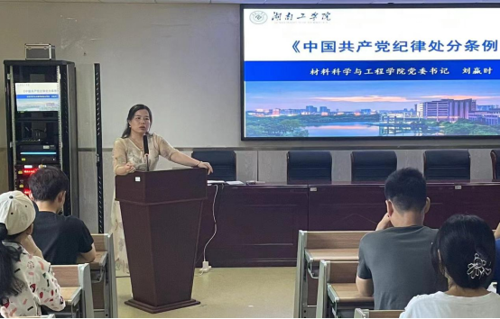 2024年6月2材料科学与工程学院党委书记刘赢时在材化楼1301报告厅给全体学生党员上纪律专题党课党委副书记李前奔,组织员曹丽慧,学生支部书记邓佩然、黄依卓、王安东和全体学生党员100余人聆听党课
