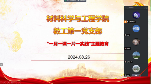 2024年8月26日,材料科学与工程学院教工第一党支部通过腾讯会议在线开展“一月一课一片一实践”主题党日活动,本次活动由支部书记侯伟主持,支部全体党员参加,活动主要包括三个部分。
