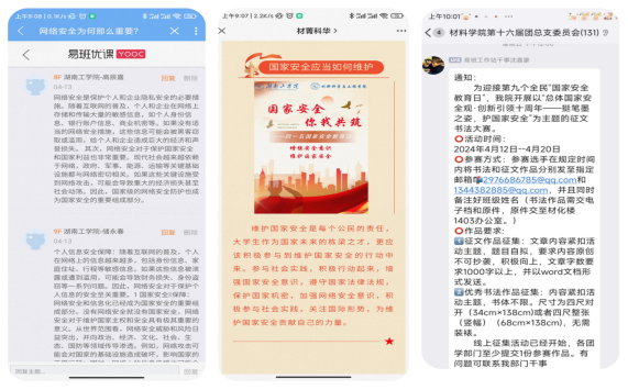 特色活动联动抓,打造安全教育“新阵地”。面向材料科学与工程学院全体学联动开展国家安全教育征文、书法、微话题大赛,引导学生主动学习宣传国家安全知识,创作国家安全教育相关作品,依托易班网络思政平台,组织学生积极参与安全教育微话题互动,截至目前共发布话题17个,学生参与讨论350次,我院学生积极响应号召,争做国家安全的“宣传者”“践行者”和“守护者”。