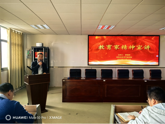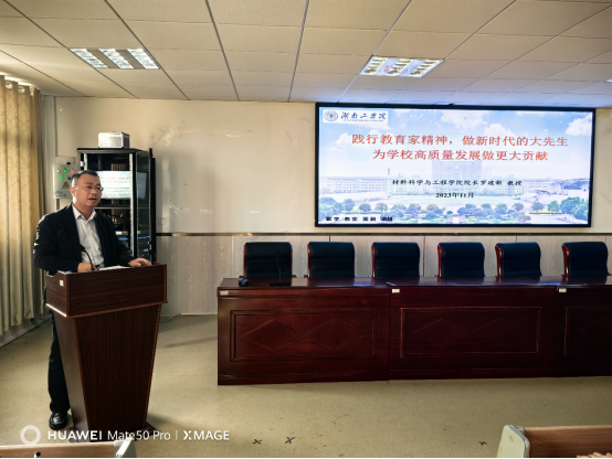 11月29日下午,为深入学习习近平总书记在致信全国优秀教师代表中所强调的教育家精神,巩固主题教育成果,推进学校高质量发展,材料科学与工程学院院长罗建新教授在材化楼1301以“践行教育家精神,做新时代的大先生,为学校高质量发展做更大贡献”为题,向全院教职工作教育家精神专题宣讲。