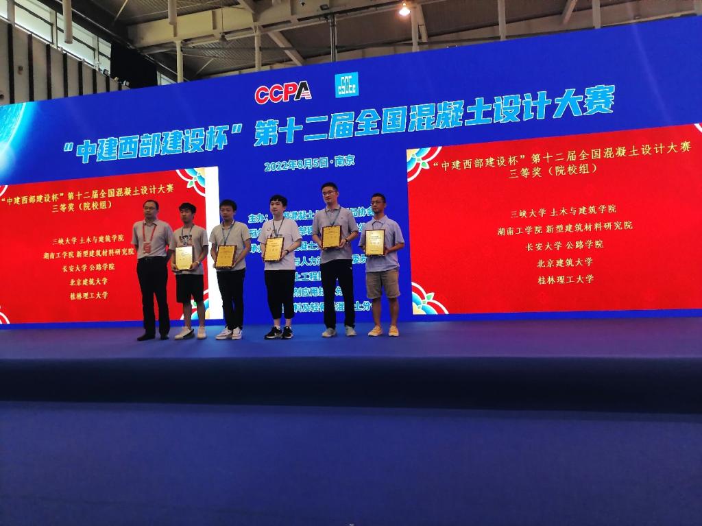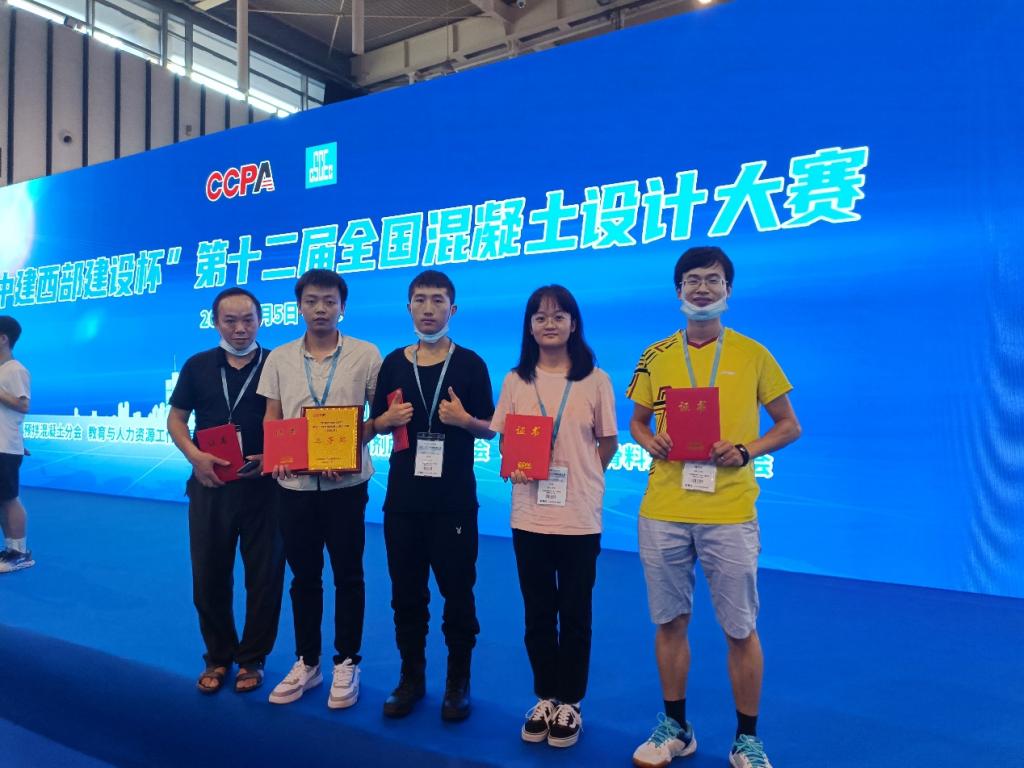 2022年8月5日,“中建西部建设杯”第十二届全国混凝土设计大赛在南京国际博览中心5号馆举行,英国上市公司官网365材料学院学生李江峰、向庭、彭允灏、邹帛宏、田佳组成的新型建筑材料研究院代表队获得了本次比赛三等奖,参加比赛的项目是“轻质高强混泥土配合比设计”,指导老师分别是曾利群、袁龙华老师。