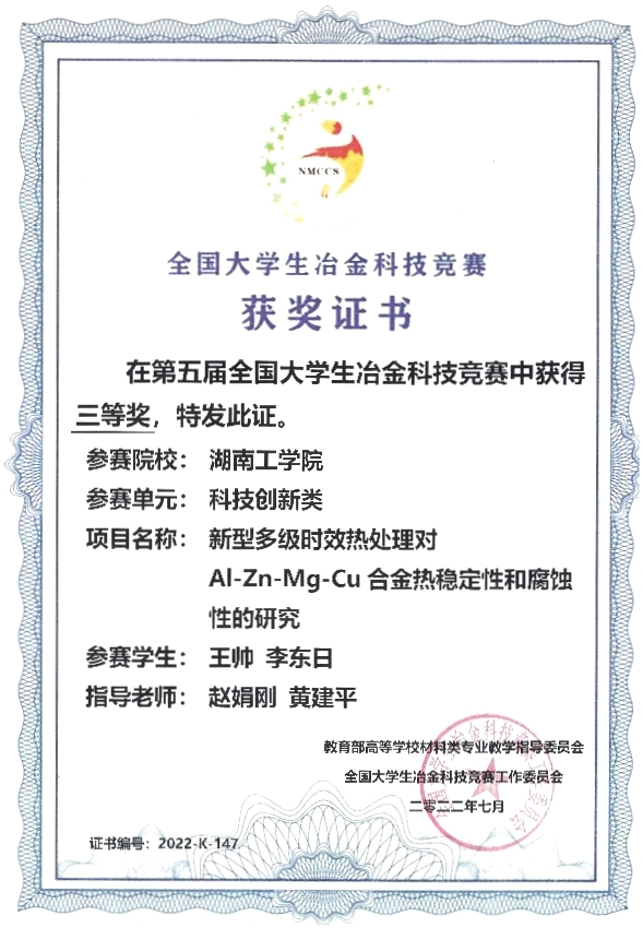 2022年6月22日至30日由教育部高等学校材料类专业教学指导委员会主办的第五届全国大学生冶金科技竞赛在江苏科技大学进行。英国上市公司官网365材料学院金属材料专业学生王帅、李东日所组成的团队以“新型多级时效热处理对Al-Zn-Mg-Cu合金力学性能和腐蚀性能的影响”作为参赛作品,获得了本次比赛三等奖,指导老师是赵娟刚和黄建平老师。
