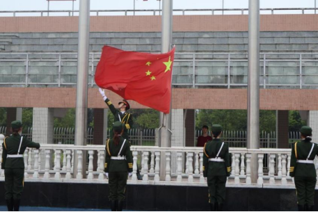 伴随着庄严的乐曲,踏着整齐的步伐,国旗护卫队护送国旗至升旗台上,庄严嘹亮的国歌响起,全体师生行注目礼,五星红旗犹如蓬勃的太阳缓缓升起。