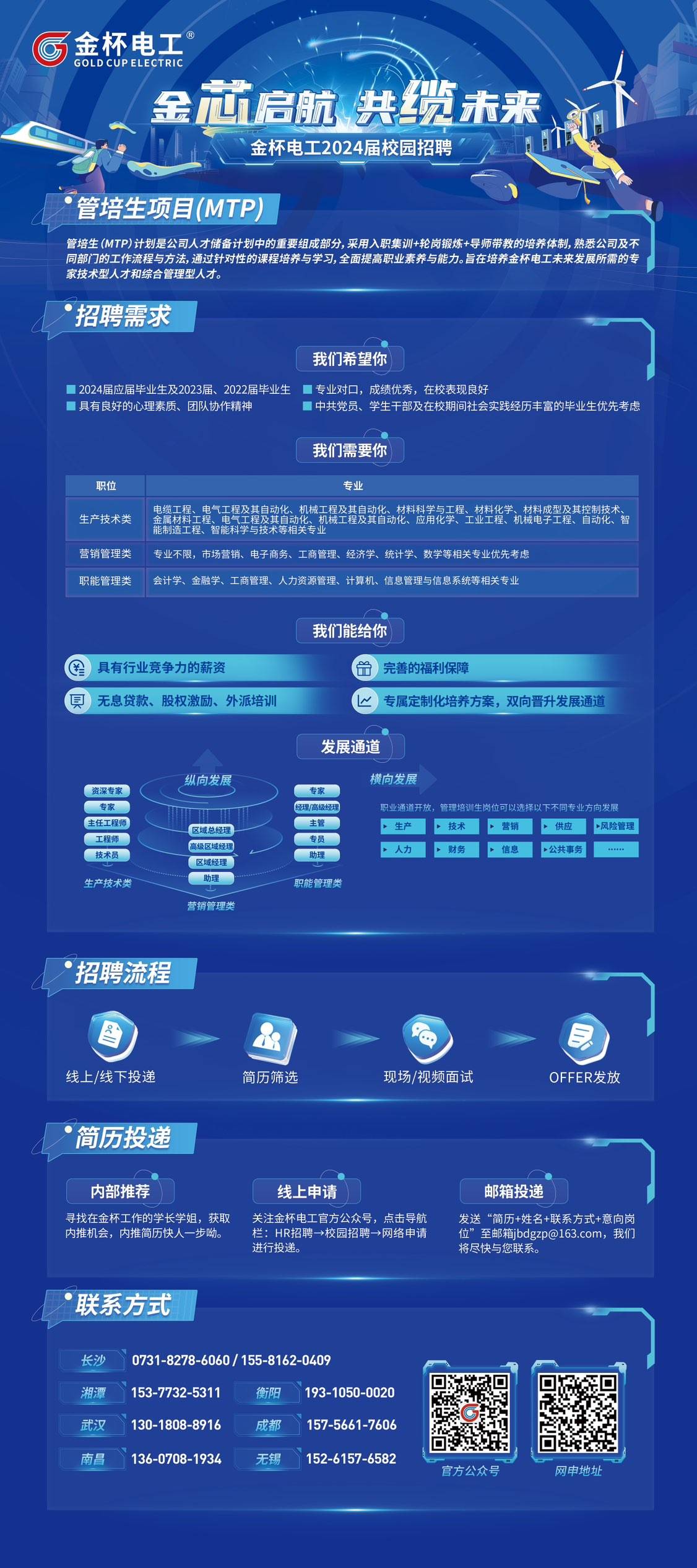 金杯电工2024届秋季校园招聘宣讲会宣讲时间:10月19日14:00宣讲地点:机械楼412教室一、公司简介中西南部地区电线电缆研发制造龙头企业荣获电线产品最高奖国家银质奖中国线缆行业最具竞争力企业20强湖南省电线电缆工程技术研究中心二、【需求岗位】研发技术类(材料、机械、电气、应用化学、工业工程、化学工程等)营销管理类(专业不限)职能管理类(会计学、金融学、工商管理、安全工程、信息管理、计算机等)三、福利待遇免费住宿+购房无息贷款+股权激励等四、联系方式1.联 系 人:傅经理2.联系电话:19310500020