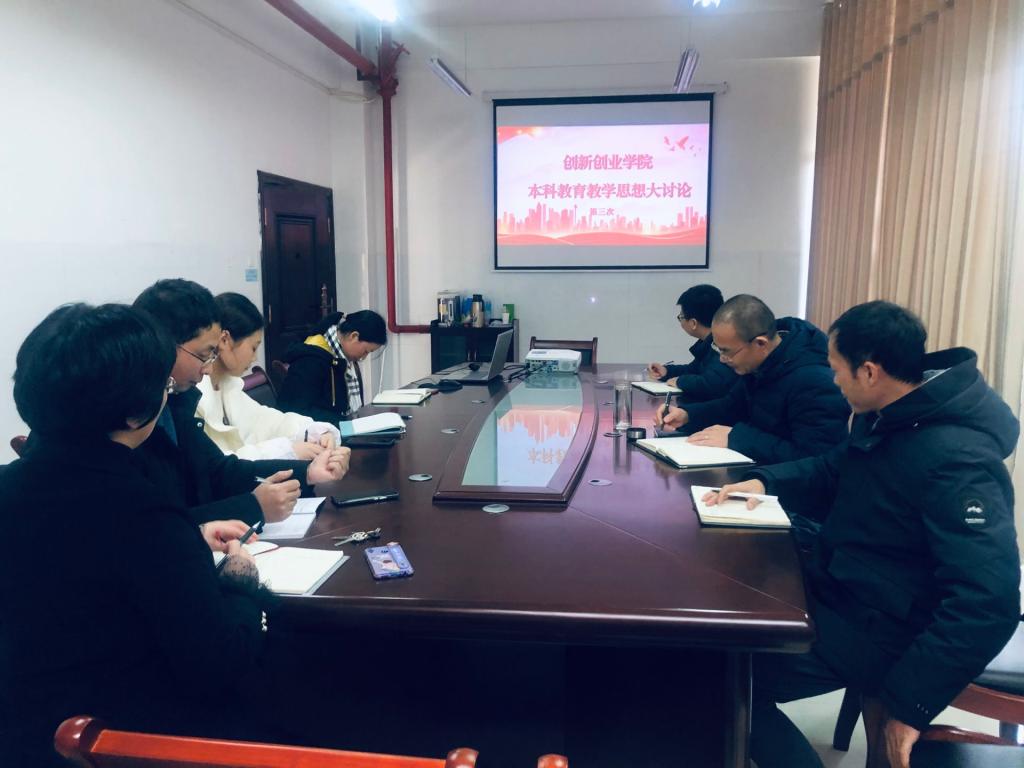 1月13日下午,创新创业学院在数理楼112会议室组织开展了第三次“本科教育教学思想大讨论”学习研讨活动。本次活动由院长张文玉主持,副院长肖奎及学院全体教职工参加。