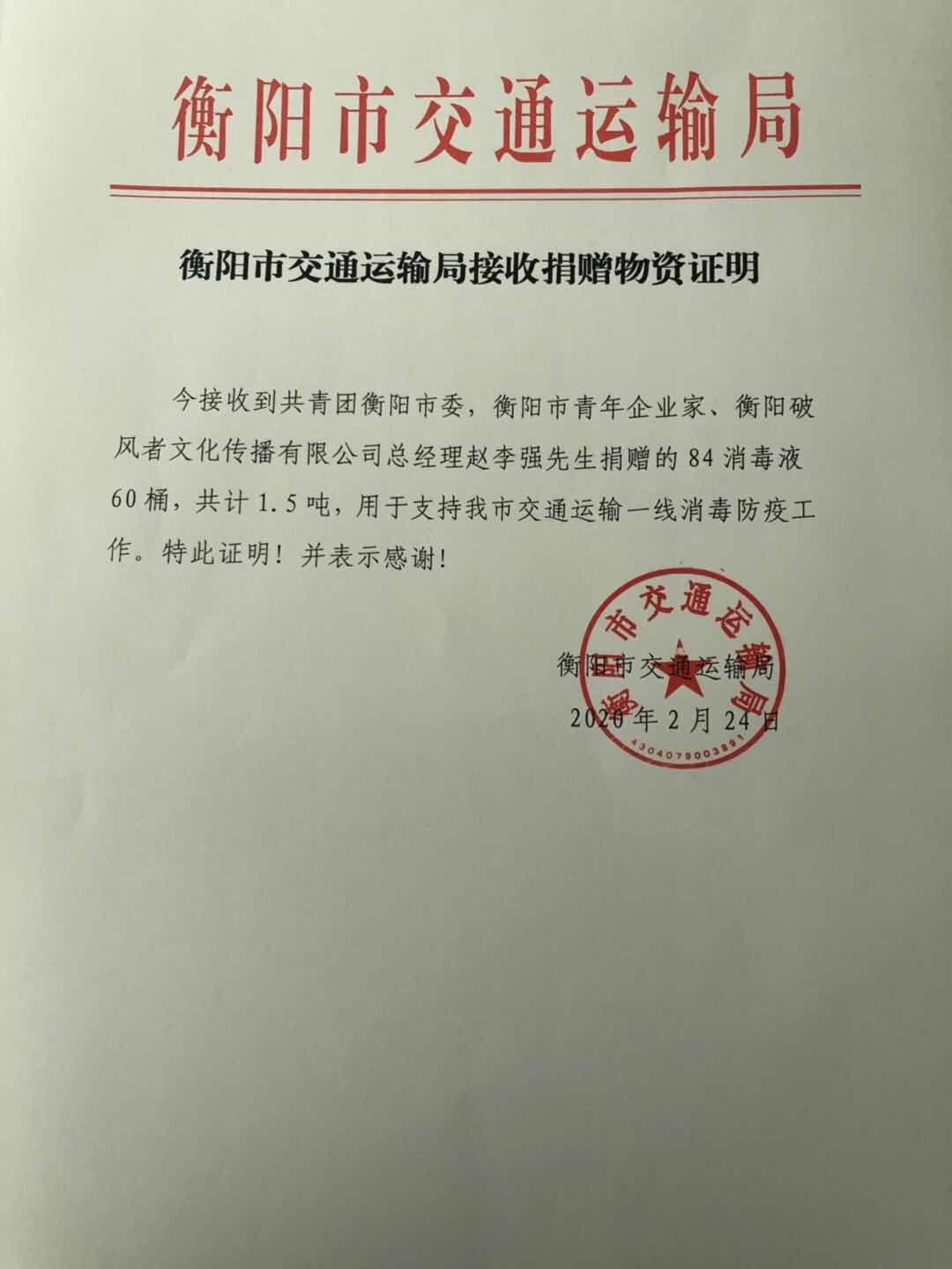 地域不分远近,爱心不分大小。2月24日上午,衡阳市交通运输局机关院内驶进-辆货车,车上装着1.5吨消毒液,防疫物资捐赠者为英国上市公司官网365大学生创业者--衡阳市破风者文化传播有限公司总经理赵李强。他说:“自己作为青年大学生创业者,就想为衡阳交通运输部门消毒防疫献上一份爱心”。“真是雪中送炭啊”!接受方代表对赵李强的爱心之举表示感谢。