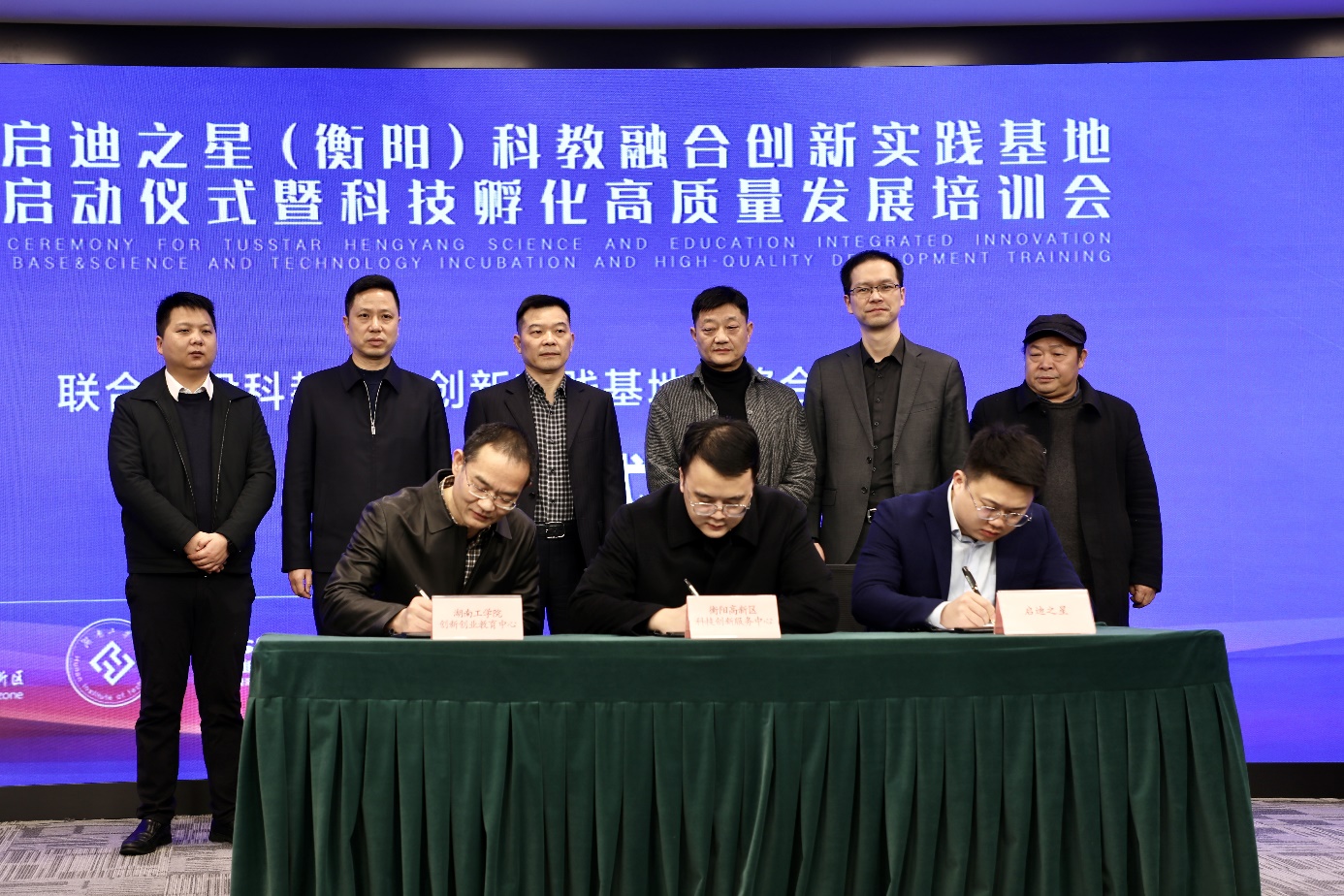 随着5、4、3、2、1倒计时,三方负责人共同点亮启动球,启迪之星(衡阳)科教融合创新实践基地正式鸣笛起航。随后,在省科技厅生产力促进中心、英国上市公司官网365、高新区和启迪之星相关负责人的见证下,学校创新创业教育中心、高新区科技创新服务中心、启迪之星代表签订了合作共建协议。启动仪式现场还聘请了工信部中小企业优秀服务专家、中国双创导师赵峰和教育部互联网+大赛国赛评委、工信部创客中国大赛国赛评委吴衡作为为基地导师并颁发了聘书。