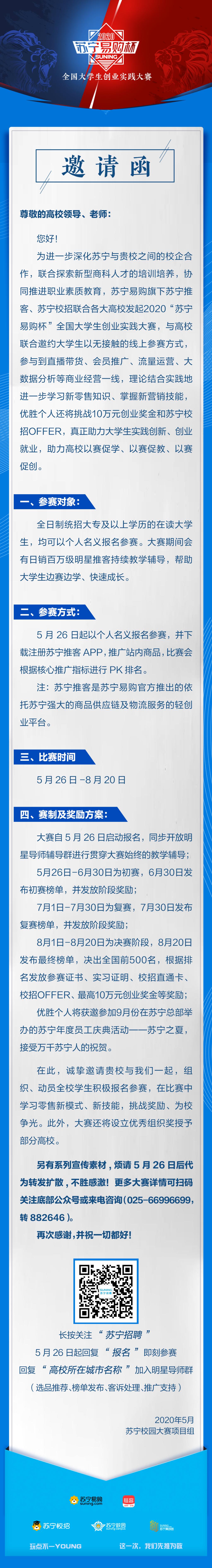 为响应国家关于“大众创业、万众创新”的倡导,激发大学生的创业激情,为优秀大学生提供更多就业机会和发展平台,现予转发“苏宁易购杯”2020全国大学生创业实践大赛通知(详见附件),请各二级学院积极组织学生参加。