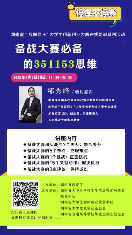 根据湖南省“互联网+”大学生创新创业大赛组委会工作要求,现发布第线上培训安排,请各二级学院创新创业大赛组委会成员、指导老师、拟参赛团队、创业孵化项目、省级及以上大学生创新创业项目负责人及指导老师准时观看