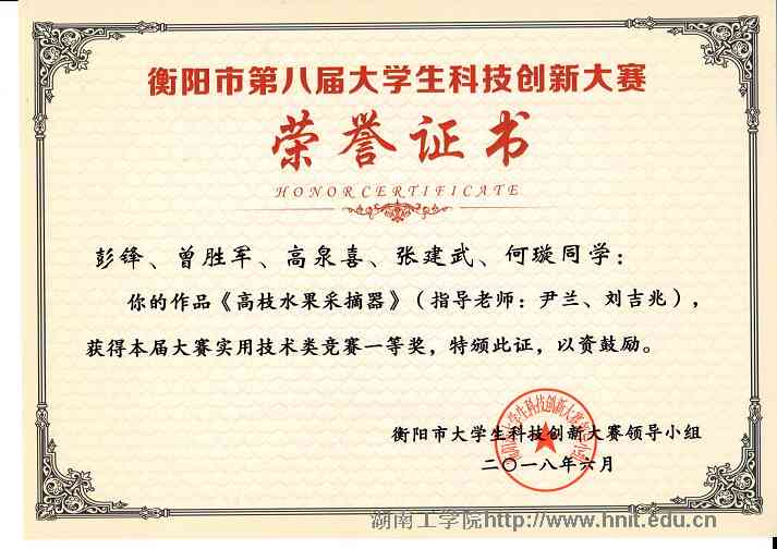 衡阳市第八届大学生科技创新大赛荣誉证书