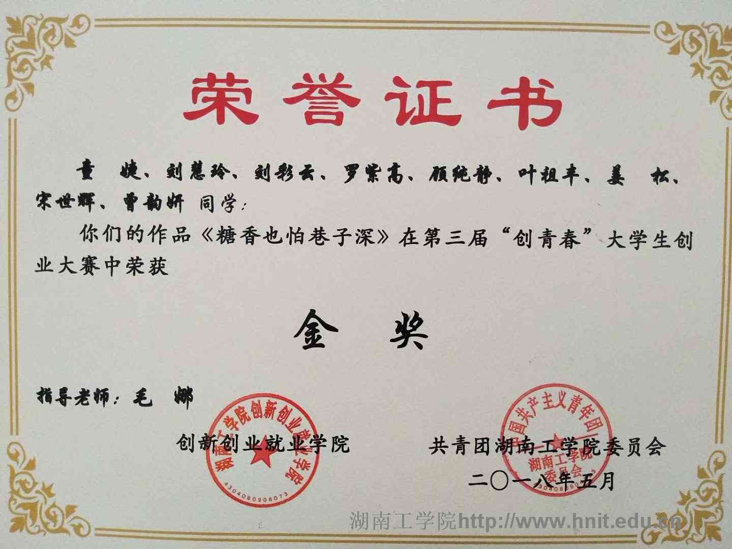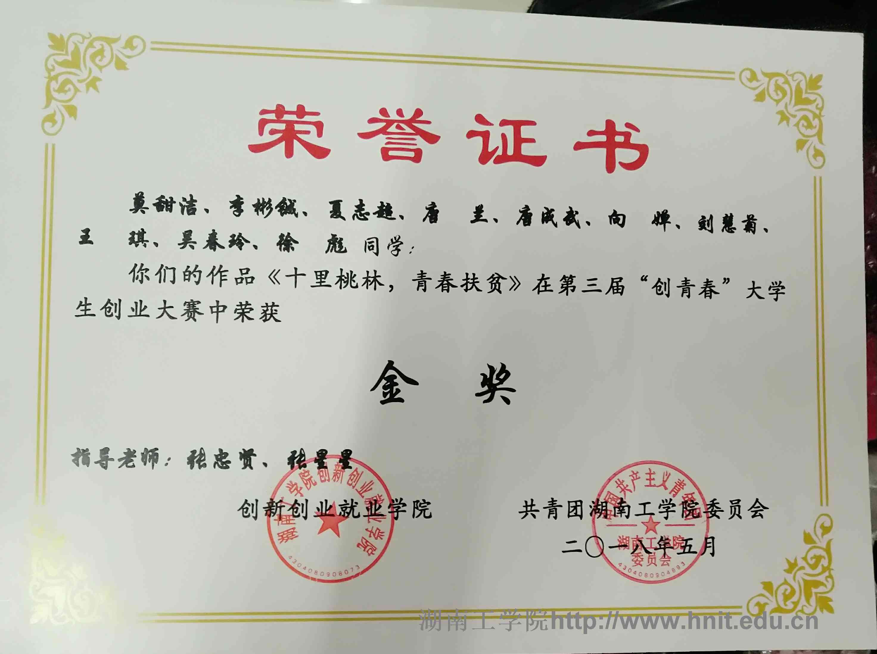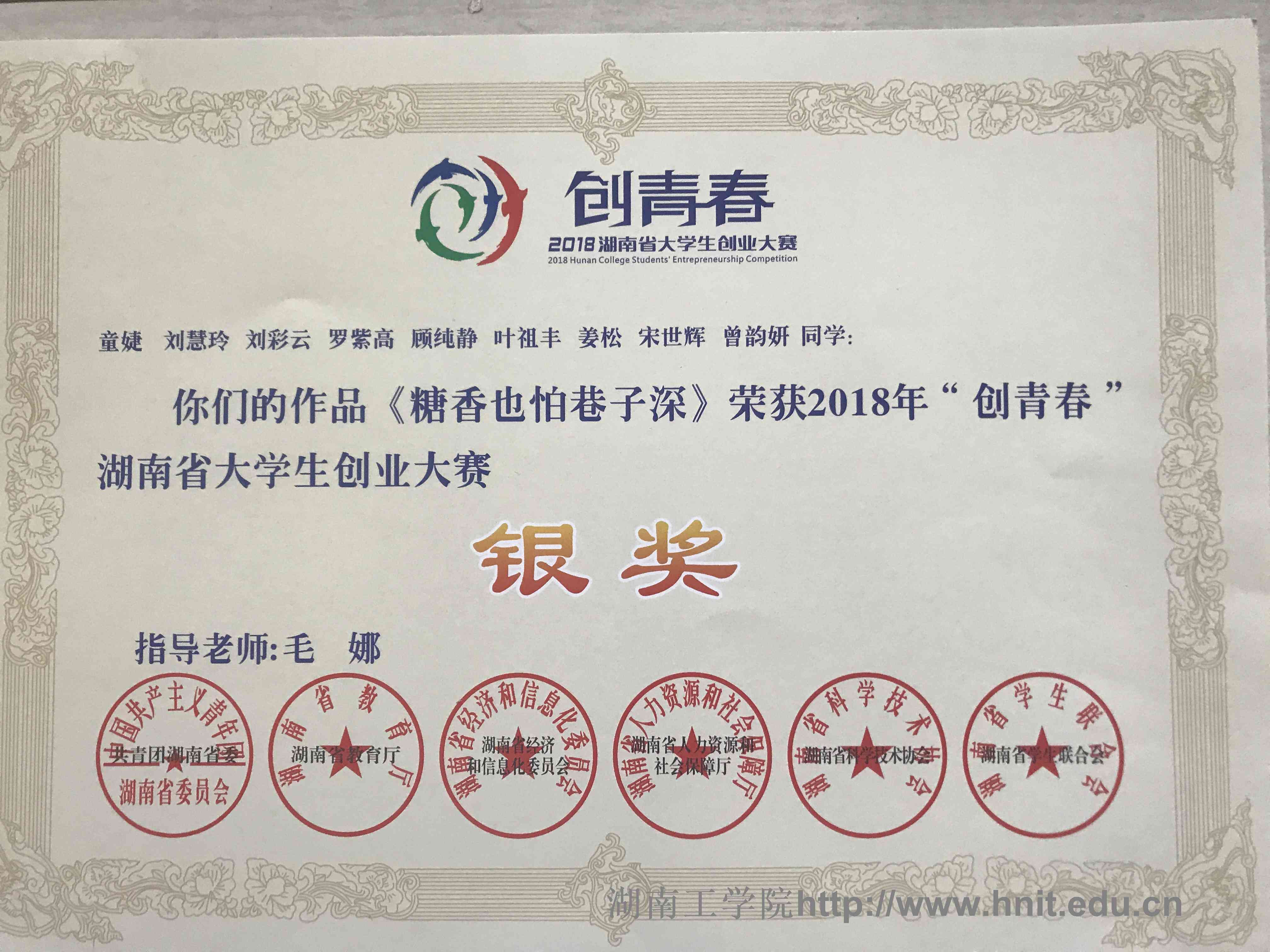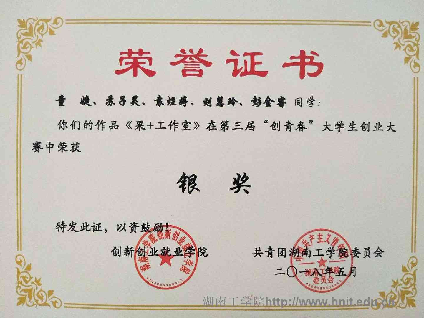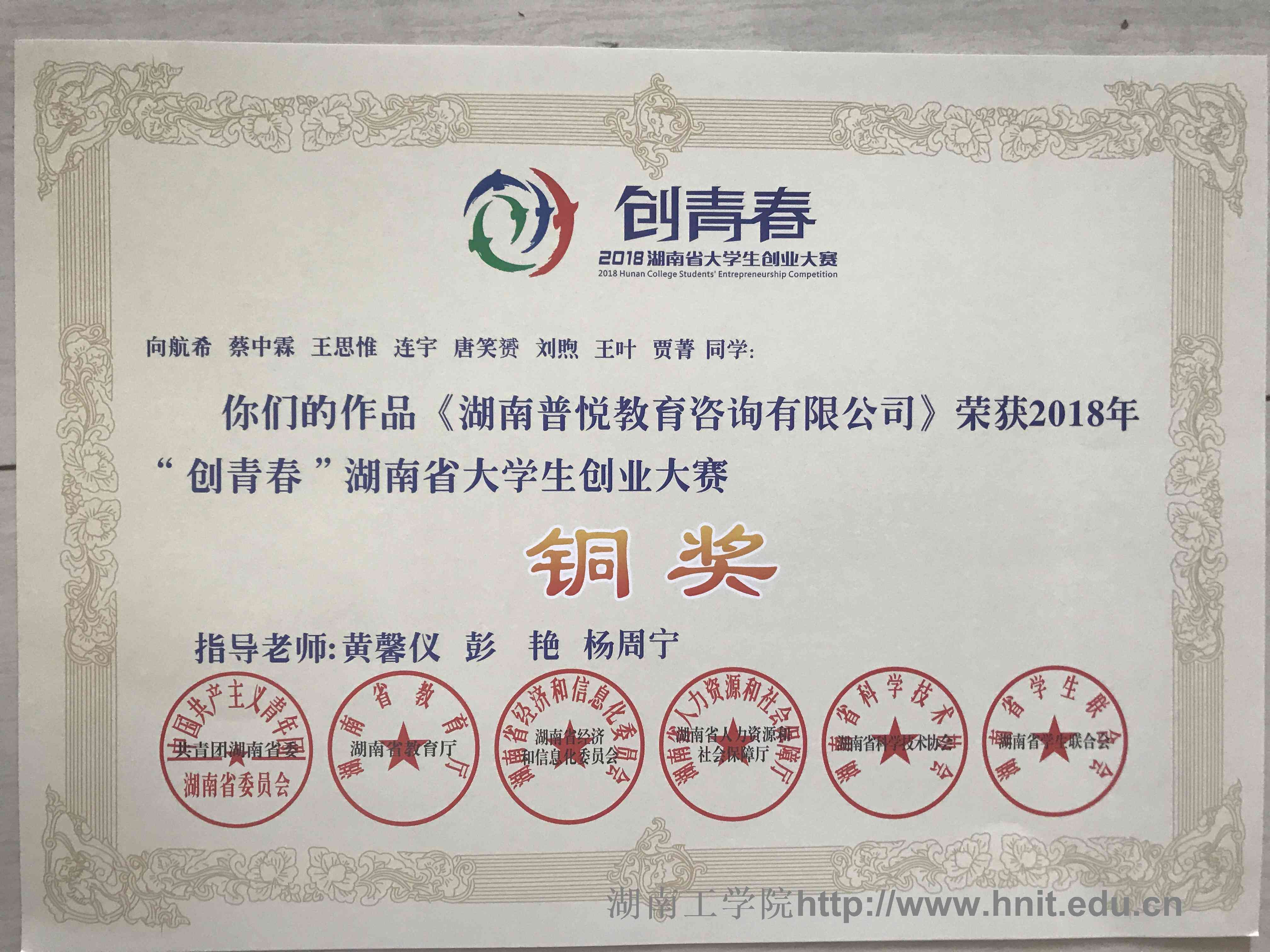 2018年创青春湖南省大学生创业大赛荣誉证书