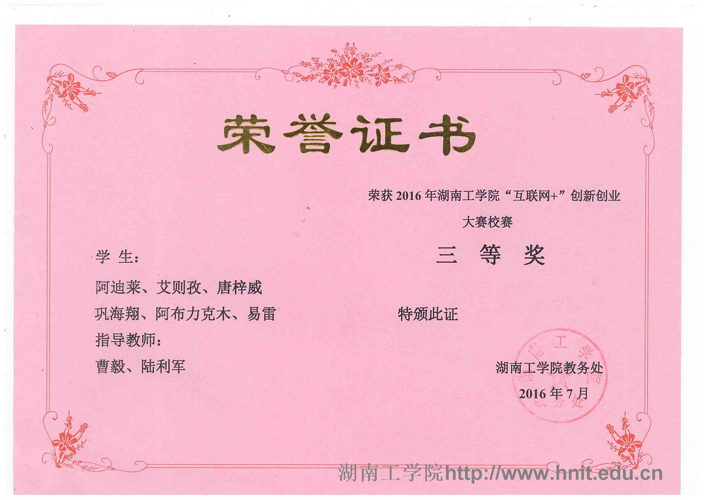 2016年英国上市公司官网365“互联网+ ”创新创业大赛校赛荣誉证书