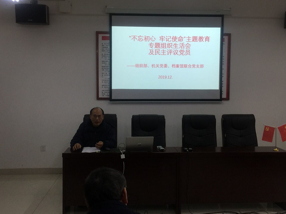 12月20日上午,组织部(党校)、机关党委、档案馆联合党支部在教学大楼509室召开“不忘初心、牢记使命”专题组织生活会及民主评议党员,党支部书记刘金春主持会议,联系支部的机关党委书记李春生出席会议,支部全体党员参会。
