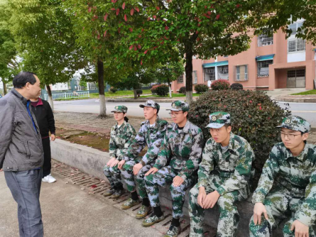 10月19日下午,电信学院党委书记范志明、院党委副书记李治军,在团委书记黄馨仪、新生辅导员王宏才的陪同下来到东门篮球场看望了军训教官和2020级军训新生。