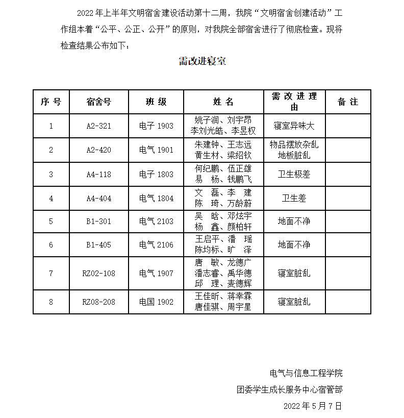 2022年上半年文明宿舍建设活动第十二周需改进宿舍