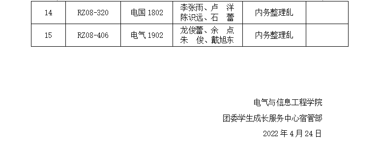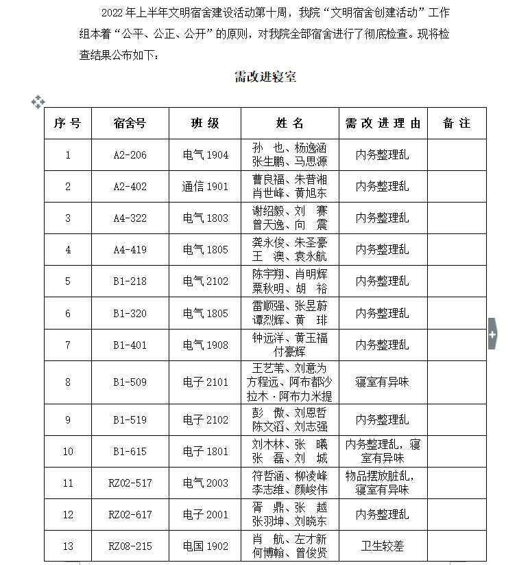 2022年上半年文明宿舍建设活动第十周需改进宿舍