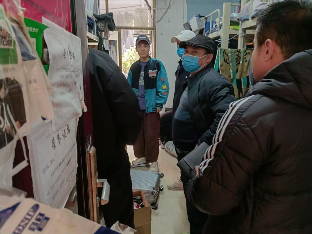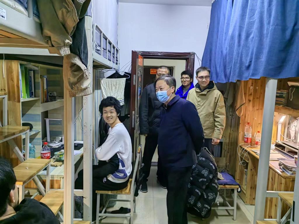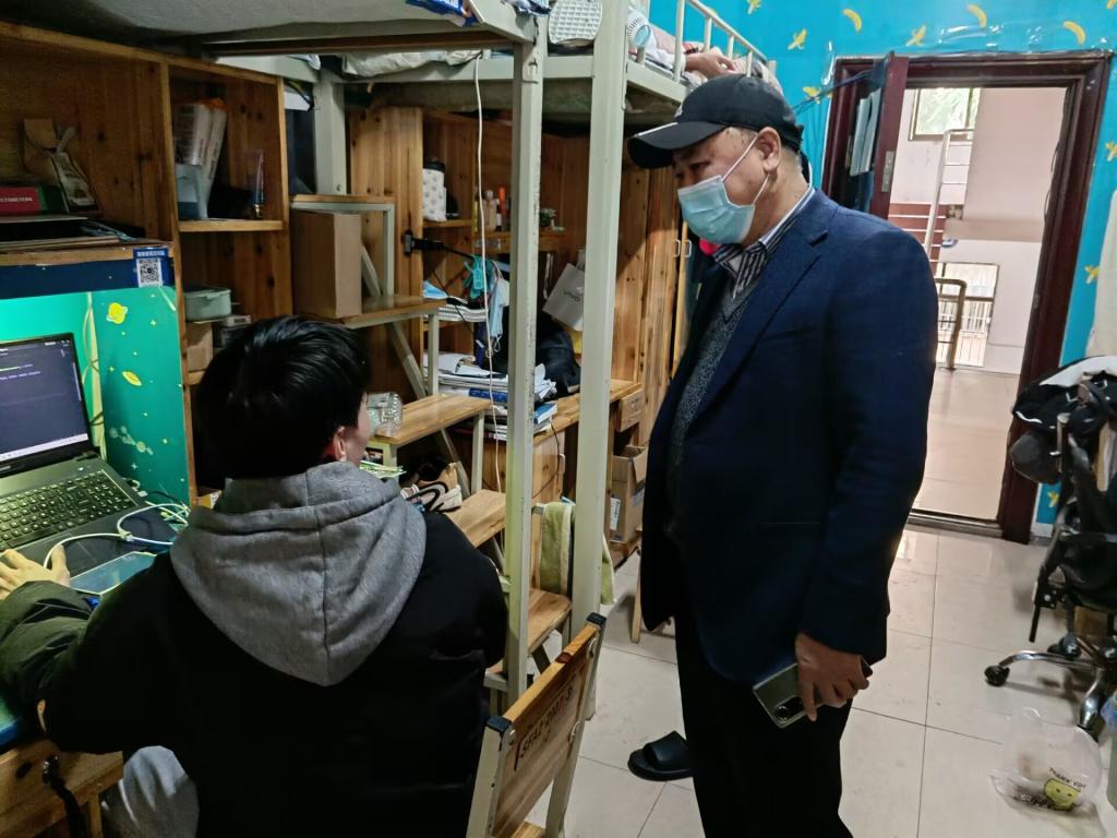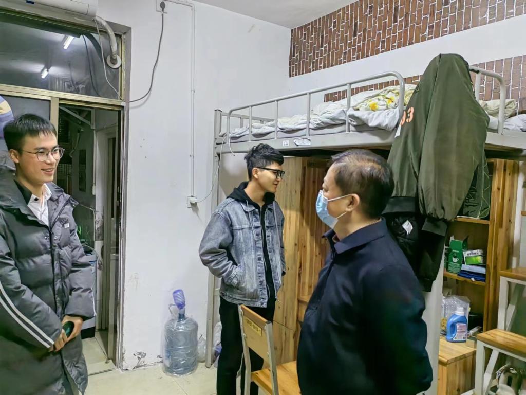 走访过程中,黄红卫一行深入学生宿舍排查安全隐患,对安全卫生状况和公共设施进行了检查,并与同学们进行了近距离、亲切的交流。了解学生自愿离校返家手续办理情况并叮嘱返乡途中注意安全,做好疫情防控自我管理和个人防护。对于暂时留校的同学,关心他们的留校原因和学习生活情况,以及临近考试的复习安排和心理状态。叮嘱同学们遇到困难时,可以及时向辅导员反馈。交流过程中,对于同学们比较关心的问题,积极倾听并逐一予以详细解答。