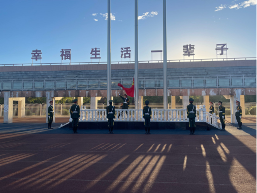6:50升旗仪式开始,学校国旗护卫队迈着铿镪有力的步伐,护卫着五星红旗走向升旗台。在雄壮嘹亮的国歌声中,鲜艳的五星红旗迎着朝阳冉冉升起。全体师生肃然静立,凝眸注视,齐唱国歌,共同祝愿伟大的祖国繁荣昌盛。