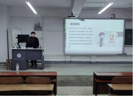 曾培同学主要从“防违法乱纪”、“防‘校园贷’险阱”、“防陷入传销组织”三个方面展开叙述,详细介绍了每个主题的相关知识。列举了违纪违法的典型案例,并解释校园贷、传销实质内涵。通过往年的真实案例,让在座听众对“权益”二字有了更加深入的了解,让大家了解权益的相关知识和如何更有效的维护自身权益。最后,他再次强调大学生要知法懂法,不得做不合适、不恰当的行为,懂得维护自身权益。