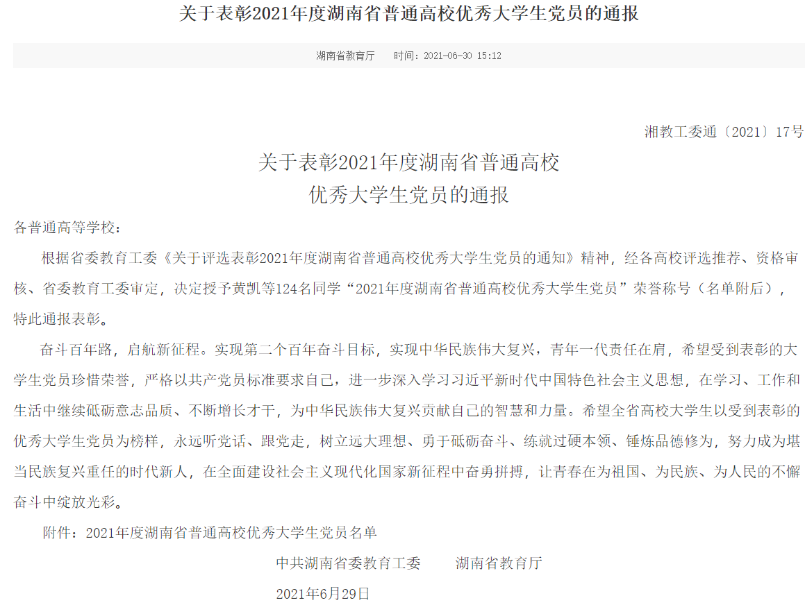 近日,省委教育工委发文《关于表彰2021年度湖南省普通高校优秀大学生党员的通报》(湘教工委[2021]17号),决定授予黄凯等124名同学“2021年度湖南省普通高校优秀大学生党员”荣誉称号。我院蔡亚明同学获此殊荣。