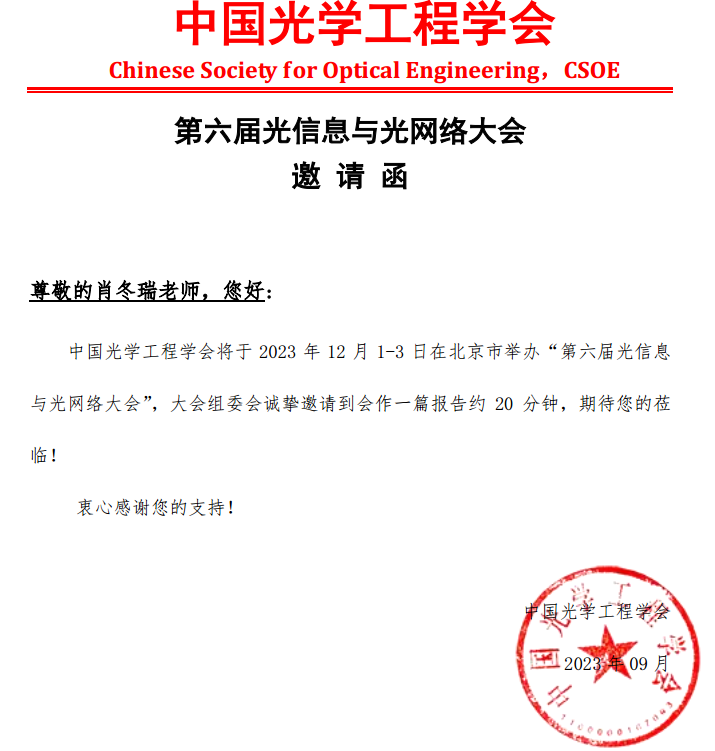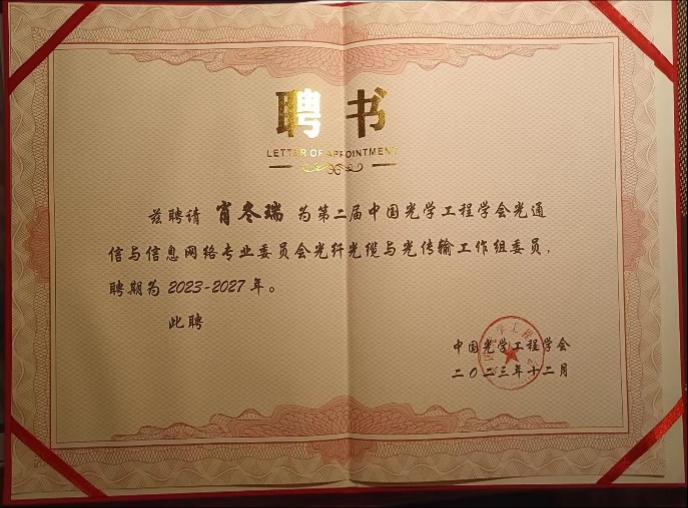 肖冬瑞博士受聘为中国光学工程学会光通信与信息网络专业委员会光纤光缆与光传输工作组委员,聘期为2023-2027年。在分委会会议上作为唯一的地方性院校代表肖博士作了相关发言。