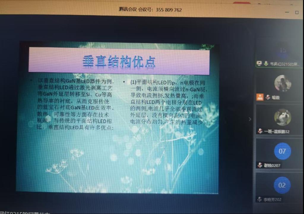 喻霞博士针对两个专业特点分别从激光剥离技术和LED显示材料两个课题和同学们进行学术讲座。鼓励同学们疫情期间停课不停学,在不放松学业的同时也要积极进行学术研讨。