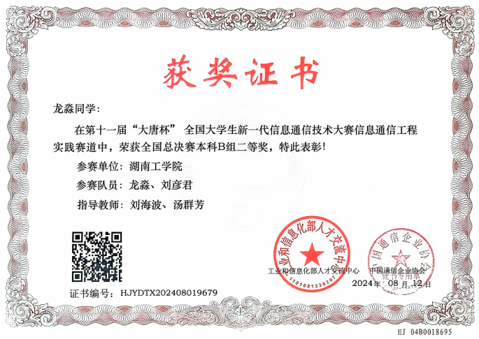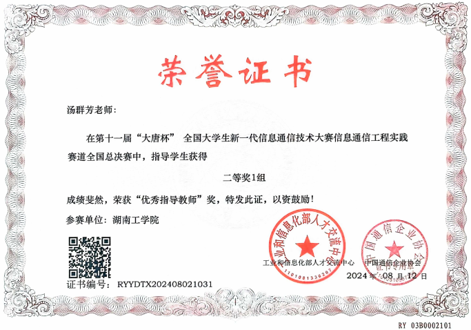 近日,根据第十一届“大唐杯”全国大学生新一代信息通信技术大赛结果通报,电气与信息工程学院学子荣获国家二等奖1项,省级一等奖和三等奖各1项,汤群芳老师等获优秀指导教师。