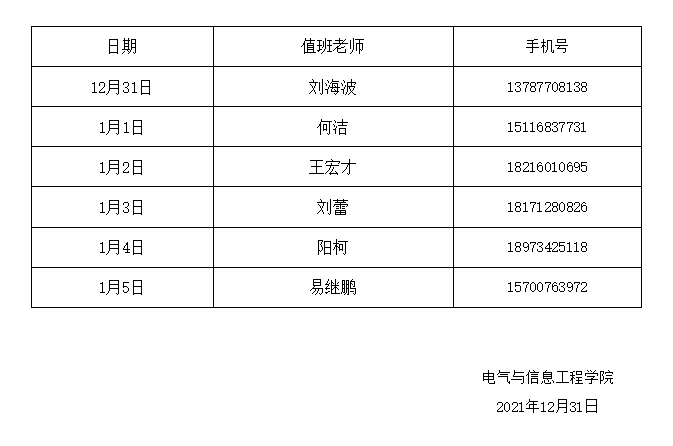 电信学院学工系统2021年12月31日至2022年1月5日晚在校值班安排