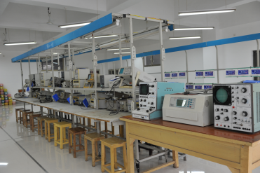 电子实训室是2004年由长沙九天实业有限公司捐赠实验设备并提供技术支持,学院提供基础条件和人力资源,双方共建,面向全校的SMT实践教学和基础研究。主要仪器设备有:电子产品生产流水线、波峰焊机、回流焊机、零件脚切割机、手动丝印台、示波器、函数信号发生器、IC测试仪、热风枪等,能够完成的实训课程有:《电子产品设计实训》、《电子实训》等。该实训室能够完成电气、信息类实训课教学大纲要求的实训项目,主要训练学生的锡焊焊接、电子产品制作、电子产品组装、生产控制等实践能力。