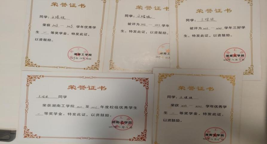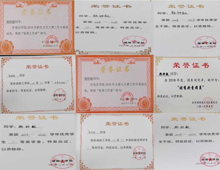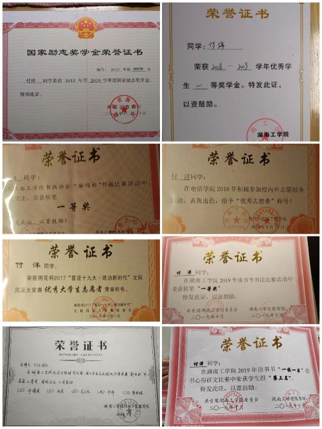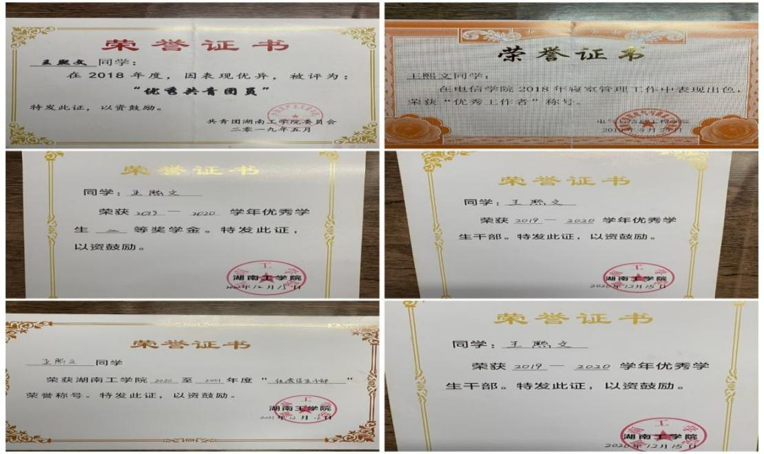 在校获得校级学金3次,其中一等1次,二等2次;在校获得优秀学生干部称号2次;在校获得国家励志奖学金1次;在校获得优秀工作者称号2次;在校获得优秀共青团员称号1次;在校2019年3月担任裕华集团湖南衡阳首届马拉松志愿者;担任英国上市公司官网365外联部副部长,担任英国上市公司官网3652019届新生教官并获得“四会”教练员称号和最硬教官称号。