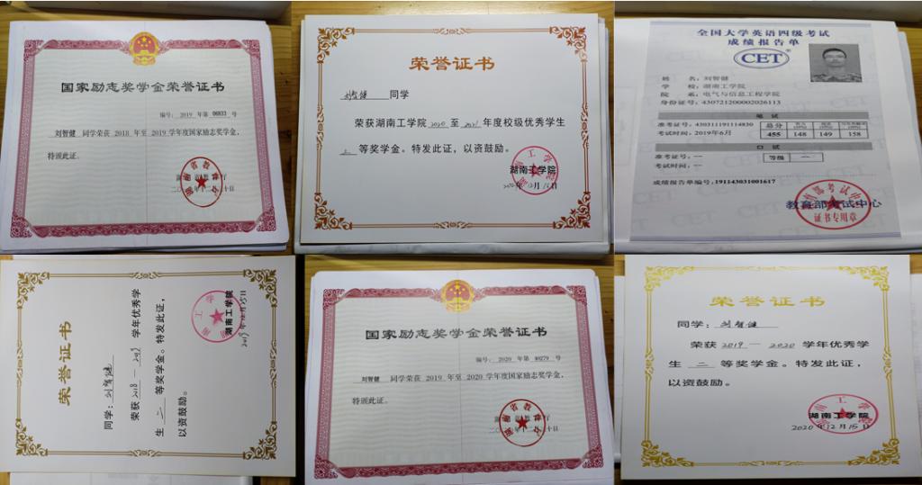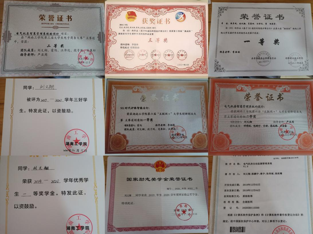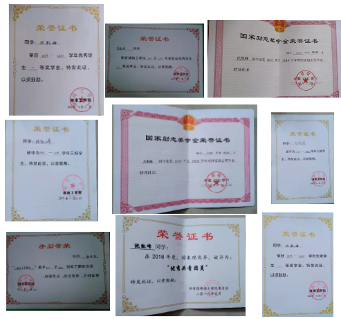 在校期间获得国家奖学金1次、国家励志奖学金2次、校一等奖学金3次、校优秀共青团干1次、校优秀共青团员2次、校优秀干部1次。此外,荣获湖南省挑战杯竞赛三等奖、校互联网+创新创业大赛一等奖、校电子商务大赛二等奖、校圆融杯电子设计大赛二等奖、院主持人大赛一等奖、院职业生涯规划大赛一等奖、院爱国主题征文比赛一等奖等奖项。通过自学获得大学英语六级、国家计算机二级等证书。