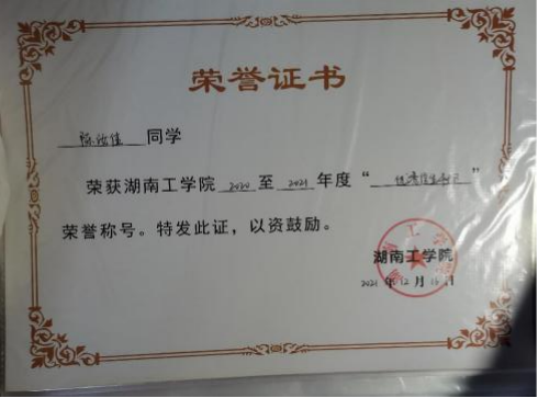 大学期间曾获湖南省高校习近平新时代中国特色社会主义思想“天天见”“天天新”“天天深”主题演讲比赛学生组二等奖,两次国家励志奖学金、校优秀共青团员、校优秀学生干部。