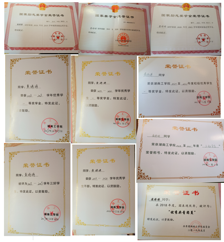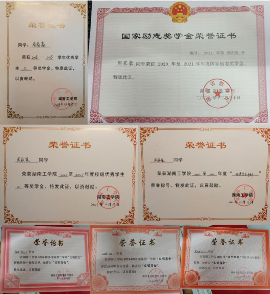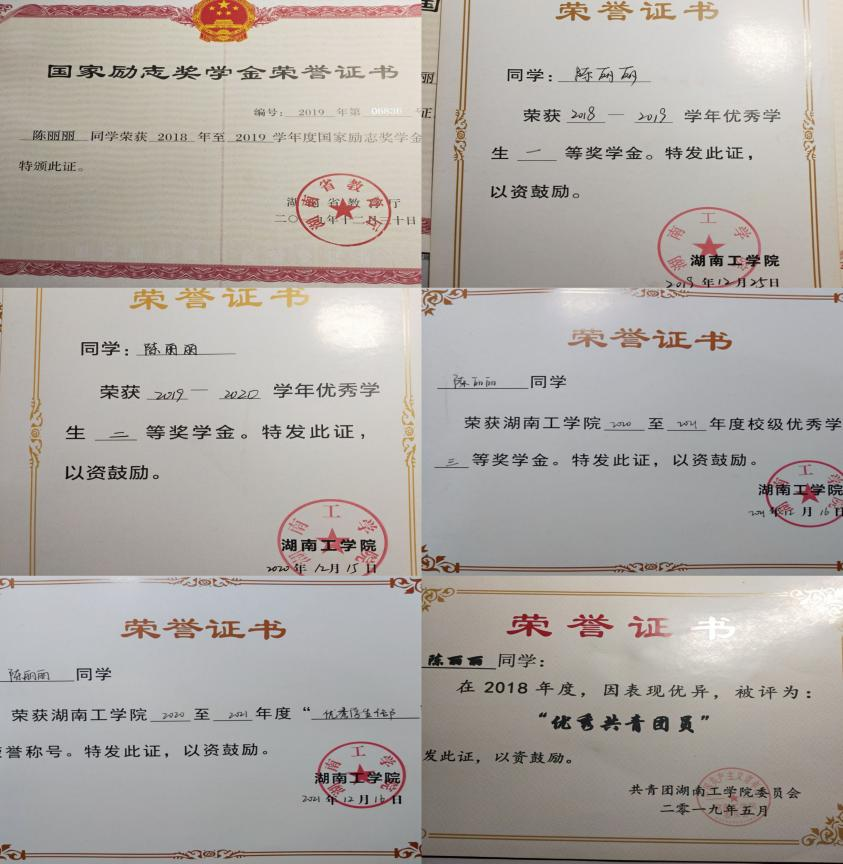 在校期间荣获一次学习成绩和综测均为班级第一,获国家励志奖学金、一等奖学金,二等奖学金、三等奖学金、优秀共青团员,优秀学生干部。