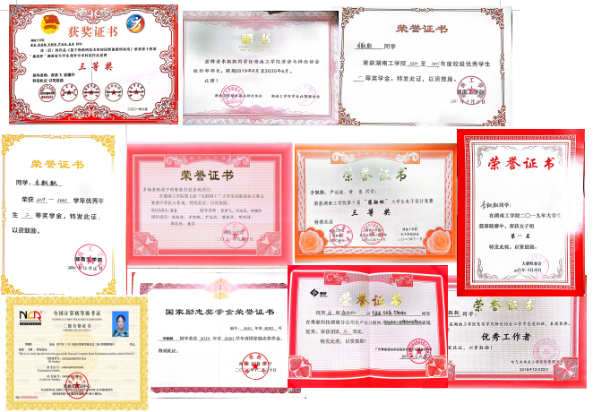在校期间曾多次获得奖学金,曾获国家奖学金1次,国家励志奖学金1次,校级一等奖学金和校级二等奖学金。曾获“圆融杯”电子设计竞赛三等奖、湖南省“挑战杯”课外学术科技作品竞赛三等奖、“互联网+”创新创业大赛三等奖,曾作为院女子篮球队员,获校女子篮球比赛一等奖,曾获“优秀共青团员”、“优秀志愿者”、“优秀工作者”等称号。