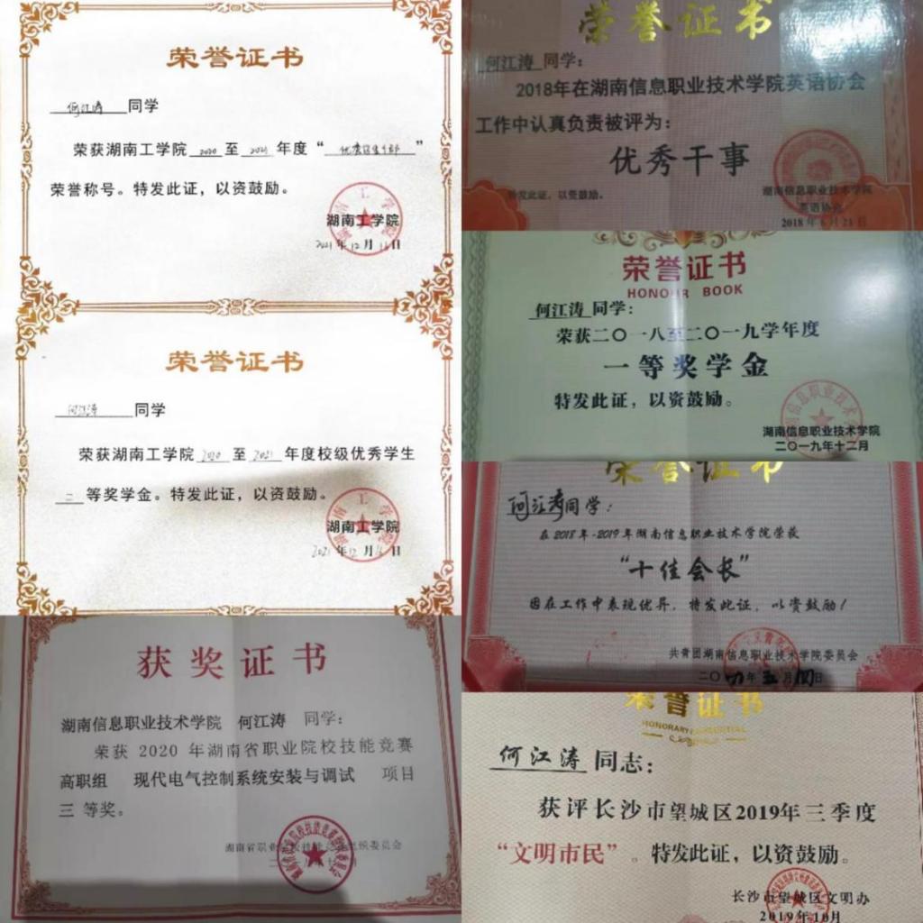 在校期间,学习专业课成绩和综测专业上名列前茅。获2018-2019年度“十佳会长”,英语协会获“优秀社团”;长沙市望城区2019三年度“文明市民”;一等奖学金1次,二等奖学金2次,获评优秀学生干部,2020年湖南省职业院校技能竞赛现代电气安装与调试项目三等奖。
