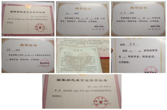 在校期间荣获国家励志奖学金两次、校级二等奖学金两次、校级三等奖学金、校级优秀学生干部、校级优秀共青团员、校级优秀学生干部标兵、校级优秀共青团干、优秀志愿者、优秀工作者、创青春科技竞赛校级三等奖,任职学习委员期间所在班级荣获校级优秀团支部、校级先进班集体等多项荣誉。