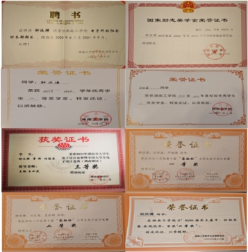 在校期间,曾获得国家励志奖学金、校级一等奖学金两次、校级三等奖学金、校级三好学生、校级优秀团干、校级优秀团员等;在课外生活中,曾多次参加社团活动及比赛,获得“圆融杯”电子设计竞赛校级三等奖、机械创新设计大赛校级三等奖。并在新生才艺大赛上获得最佳团体奖、最佳组织奖。