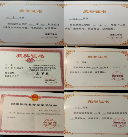 在校期间荣获国家励志奖学金、校级一等奖学金、校级二等奖学金、两次校级三好学生。2021全国大学生电子设计大赛省级三等奖,第六届学生思想政治理论课研究性学习成果展示竞赛校级二等奖。